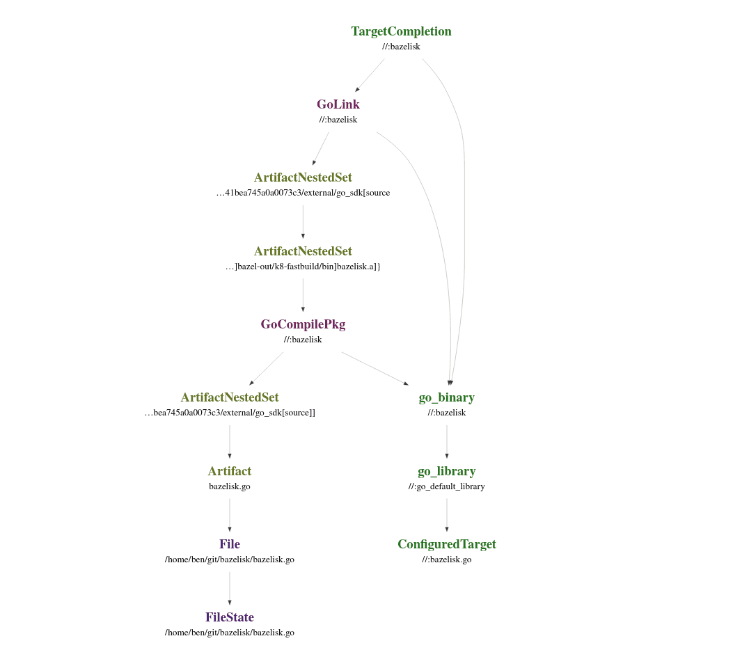 The Bazel documentation gives a good overview of Skyframe that is worth reading if you’re interested, so we won’t go into the details here. Essentially though, Skyframe is the underlying model that Bazel uses to determine what actions it needs to perform when you run a command. The main Skyframe data structure is a dependency graph where the nodes are entities like ConfiguredTarget, FileState and ActionExecution.