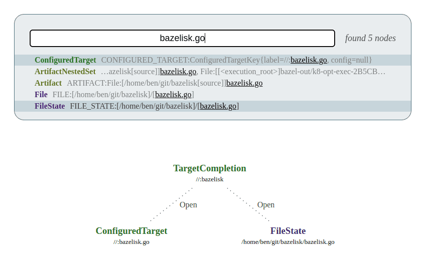 bazel run -- @skyscope//:importThe fewer dependencies the target you build has, the faster the import process will be. Once it is complete you will be prompted to open a link in your browser to view the graph. In the main search box, enter rule labels or filenames to find and display as nodes: